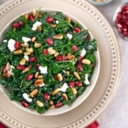 Place the kale in a large salad bowl with the pomegranate seeds and pine nuts. If you are serving the salad immediately, add the cheese. Otherwise, you can refrigerate the salad at this point.